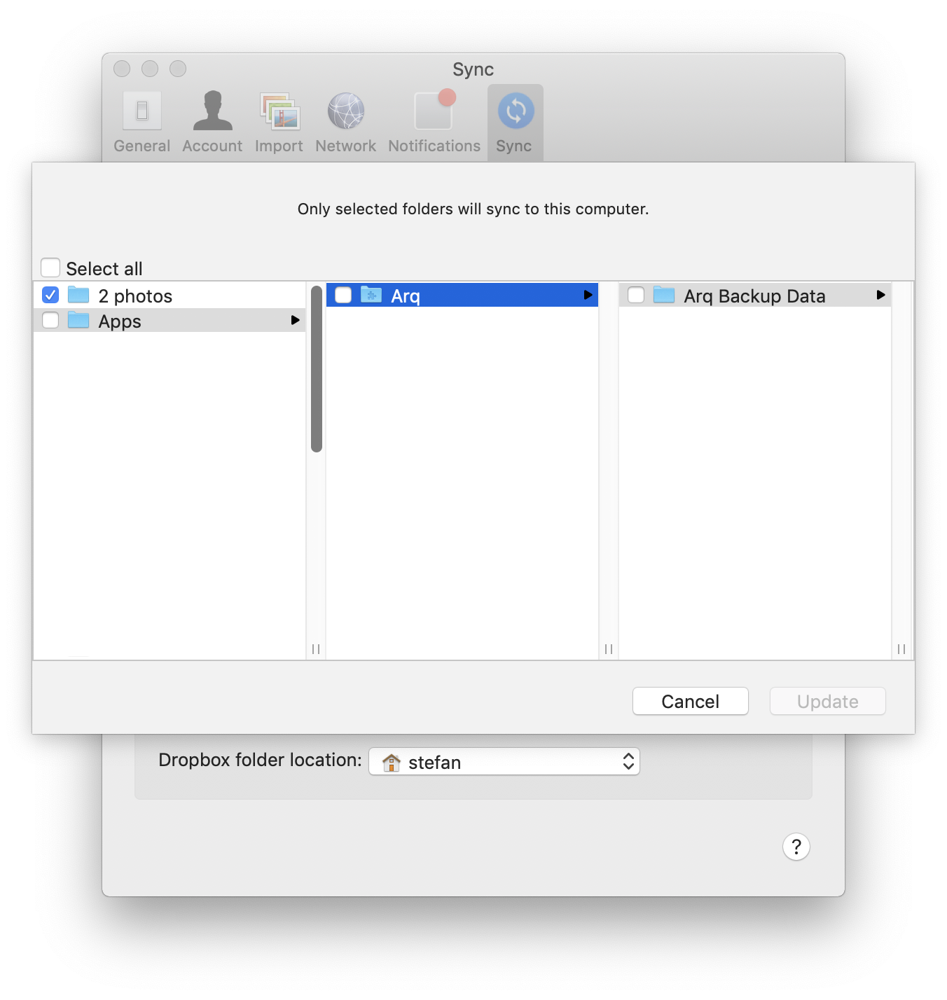 Click the "Apps" folder in the first column. Then uncheck the checkbox by "Arq" in the second column. Then click "Update":